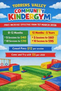 After much careful consideration, the Kindergym Committee has made the decision to increase the cost of our 0-12 month “Baby Pass” to $70 for a 10-session pass and $40 for a 5-session pass (this is a new option). In addition, for children aged 12 months to 5 years the “All Ages Pass” will stay at $95 for a 10-session pass, and will increase to $60 for a 5-session pass. Casual passes are available at $12 per child (regardless of age). A come and try session will remain at $5 per child. These changes will take effect from 1 March 2026.